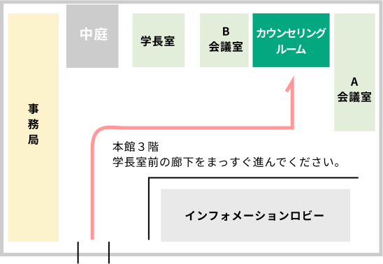 利用方法 | [メールでの予約]※十分な時間を確保するために、なるべくメールでの事前予約をお願いします。 ★下記カウンセリングルーム専用メールに、 ★カウンセリングルーム専用メール ※カウンセリングルーム宛にお送りいただいたメールは、健康保健センター職員も共有します。 [直接来室しての予約]★開室時間に直接カウンセリングルームへお越しください。ただし、相談中の場合は対応できません。 [健康保健センターでの予約]★健康保健センターの窓口にて、空き時間を確認して予約できます。 |