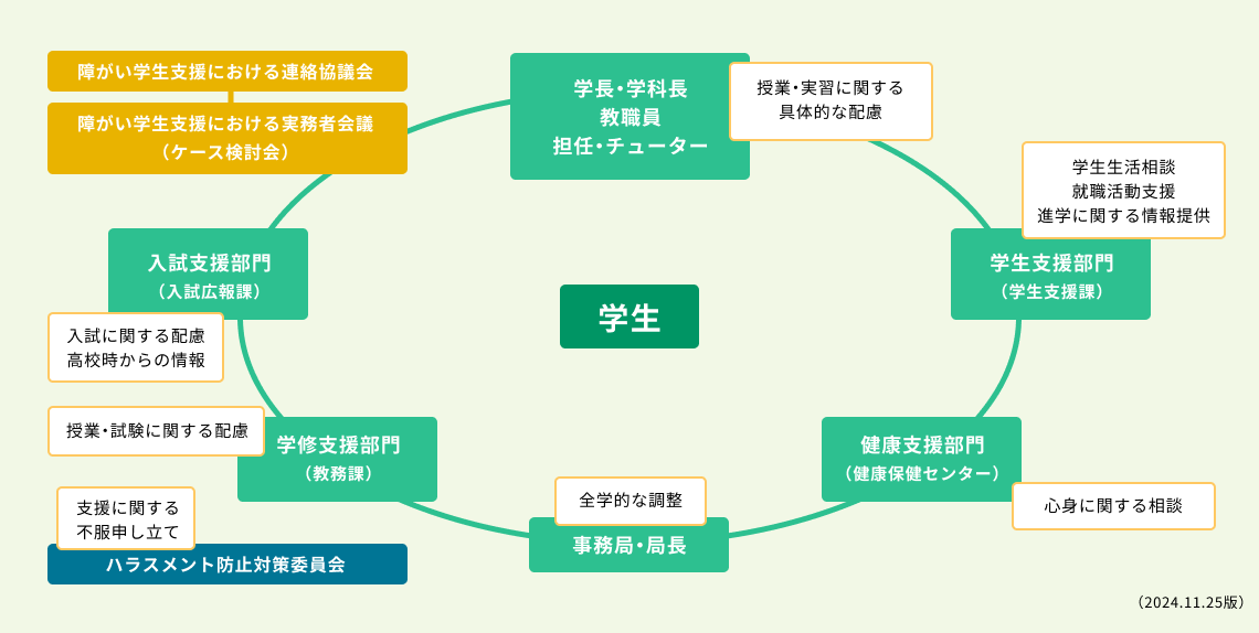 身体障がい、発達障がい、精神障がい、慢性疾患あるいは心理的問題その他(以下「障がい等」という)がある学生の修学及び学生生活の支援を行うことを目的として「障がい学生支援室」を設置しています。障がい等が理由で、修学上日常的な個別の支援が必要な学生に対し、本人からの希望があった場合、学科や関係部署と連携し支援を検討していきます。修学上困りごとがある学生は、健康保健センターにご相談ください。