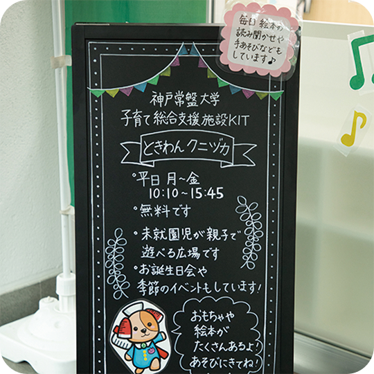 子育て総合支援施設「KIT」は、大学のある神戸市長田区が子育てしやすい環境になるよう、地域の方と共に学び支え合って、一緒に成長していける場所。子育てを支援する「ときわんクニヅカ」、小学生の学びを支援する「てらこや」、地域の方の交流の場となる「KOTIE(コティエ)」の施設で構成しています。本学では、これらの3つの施設が1つの場に集まることで、世代や性別、文化の違いを超えた交流が生まれ、地域の未来を開く力となると考えています。