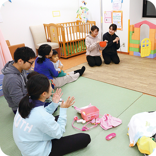 離乳食や授乳、おむつ交換など地域のお母さんの困りごとの相談を受け、専門家が支援を行っていきます。学生は自然な触れ合いの場での子どもたちを見守ることで、母性・小児看護学の学びに役立てます。
