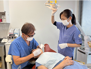 歯の表面に付着している歯垢(プラーク、バイオフィルム)を除去したあと、PMTC(Professional Mechanical Tooth Cleaning)を実施しています。PMTCとは専門家による機械的歯面清掃のことを言います。当診療所での「歯のクリーニング」は機械や器具を使用し、痛みなく、歯をつるつるの状態にします。そのため、歯医者さんが怖くて、なかなか受診できない方も心配せずに安心してお見えになってください。