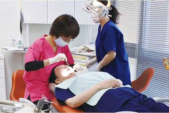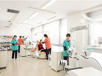 神戸常盤大学では、リカレント教育の拠点となる口腔保健研究センターを、日本で初めて大学内に設置しています。口腔保健学科の在学生の実習のほか、卒業生や既卒の歯科衛生士の学習や研修の場、地域の方々への啓発活動の場としても活用しています。神戸常盤大学の医療系教育機関としての特性を活かし、口腔保健研究センターでは、神戸常盤大学歯科診療所において、小児のう蝕予防や地域住民の歯周病の予防を通して口腔の健康の維持増進にかかわり、国民のQOL(生活の質)の向上に貢献することを目的としています。口腔保健学科の臨地実習の場として活用するほか、地域で働く歯科衛生士の生涯研修や復職支援も企画しています。
