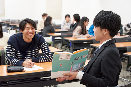 幼稚園・小学校・中学校理科教諭および養護教諭の免許状取得を目指す学生には、受験自治体の選択や効率的な受験対策に生かせるよう、兵庫県、神戸市、大阪府および関東圏を中心に、タイムリーな情報提供を行っています。また、採用試験対策に欠かせない過去問題集や参考書のほか、小学校と中学校で実際に使われる各種教科書なども揃え、いつでも閲覧できるように環境を整えることで、教員を目指す学生をサポートしています。