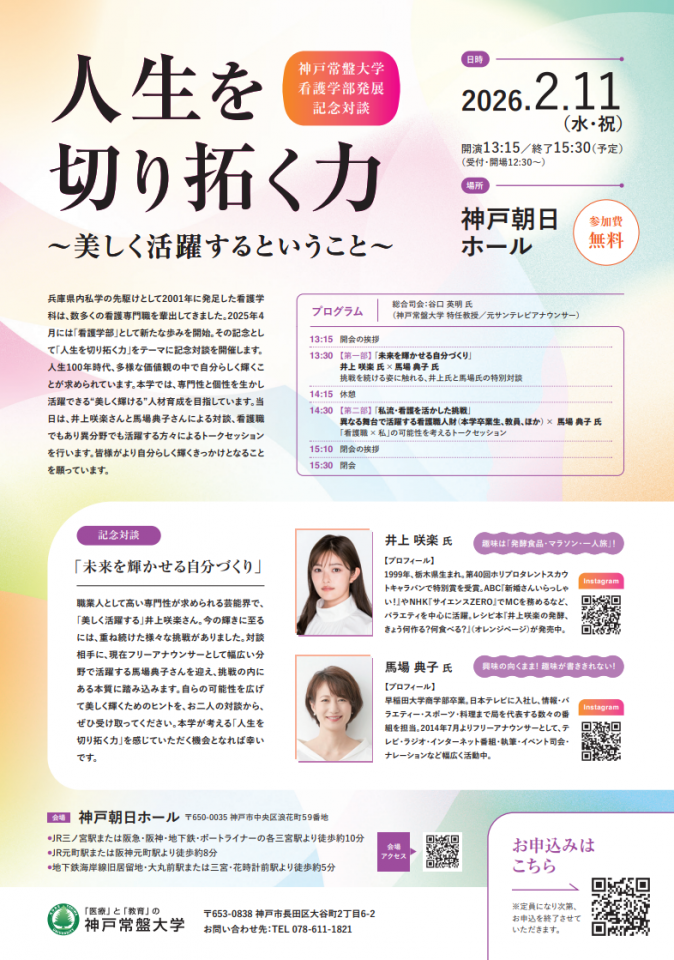 兵庫県内私学の先駆けとして2001年に発足した看護学科は、数多くの看護専門職を輩出してきました。2025年4月には「看護学部」として新たな歩みを開始。その記念として「人生を切り拓く力」をテーマに記念対談を開催します。