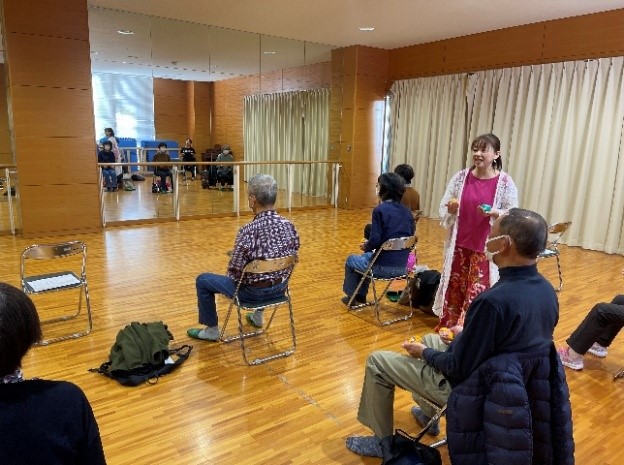 かきらの説明や体の仕組みについて講義後、椅子に座った状態で、先生の動きをまねして体操しました。