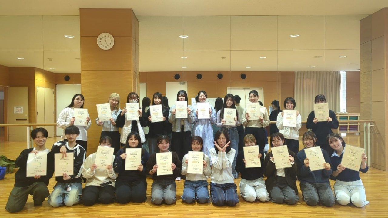 先日,2つの科目を修得した学生にリトミック指導資格認定証の授与式を行いました。この写真は授与式後の記念写真です。「リトミックⅡ」の履修者24名が資格取得を果たしました。みんな来春からそれぞれの進路へと羽ばたいていきます。資格認定証を手にして,現場でも活用していく意気込みが感じられました。