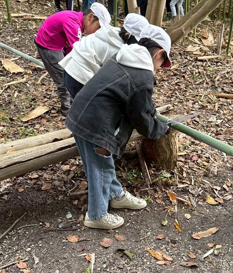 学生と教員のサポートを受けながら、のこぎりを使って竹を切り、コップやペン立てなど思い思いの作品づくりに挑戦しました。子どもたちからは「のこぎりはむずかしいけど楽しい!」「自分で作れた!」といった声が上がり、自然素材を扱いながらものづくりの喜びを味わう姿が見られました。
