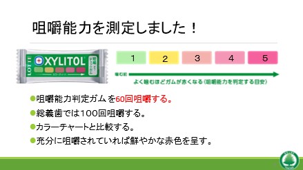今回は、学が丘保育園地域活動の一環としての健口教室開催に先駆けて、保育士さん自身のお口の健康に目を向けていただく講話会から始めました。お口の複雑な動きを体感するために咀嚼能力を判定できる色が変わるガムを噛んでみました。普段とは異なる食べ方、開口や片側噛みでは上手く噛めないことも体験してもらいました。保育士さん自身のお口の健康に目を向けることで、子どもの口腔機能発達不全症について理解が深まり、さらに詳しく学修したいとのお声が多く寄せられました。今後も専門職が互いに学び会う環境を大切にしていきたいと思います。 学が丘保育園保育士の皆様にはご理解とご協力を賜りまして心より感謝申し上げます。