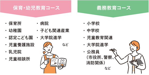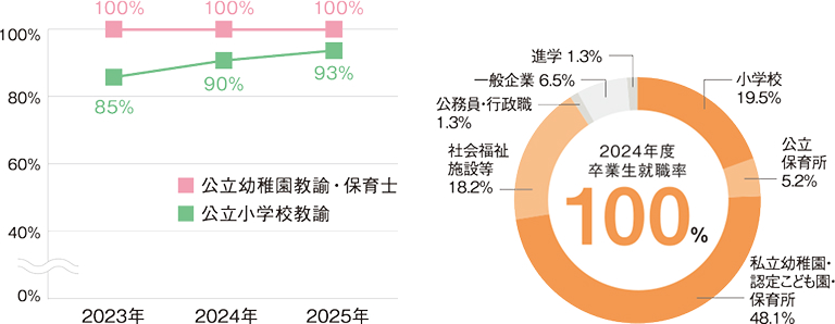 毎年、就職希望者全員が内定をいただき、理論と実践を融合させた保育と教育のプロフェッショナルを輩出しています。卒業生の半数は、公立保育所や公立小学校、地方公務員、地方自治体外郭団体などに就職。私立幼稚園、私立認定こども園、私立保育所、社会福祉施設への就職を含むと、約9割が保育士・教員などの専門職として活躍しています。