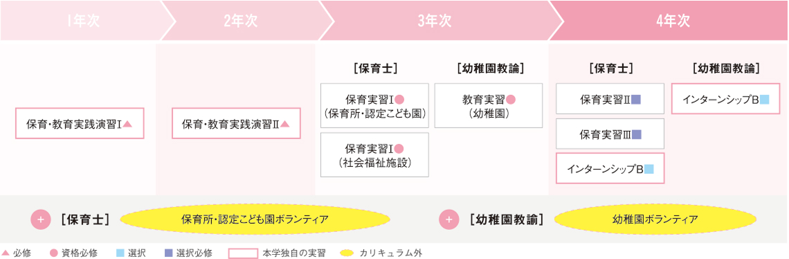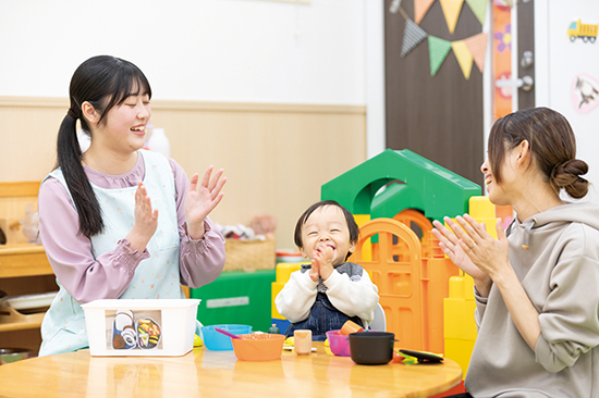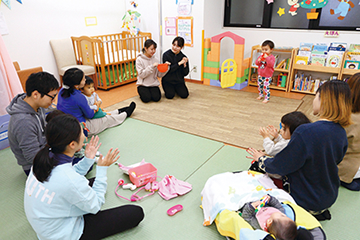 豊富な経験を積むために、1年次から積極的に実習を取り入れて、理論と実践の融合を目指します。子育て支援の場が学びのフィールドになるため、保育の対象である子どもだけでなく、その保護者と触れ合う機会も豊富です。通常の実習では体験できない経験を積むことで人間性と専門性の両面を磨き、保育・幼児教育のプロフェッショナルを養成します。