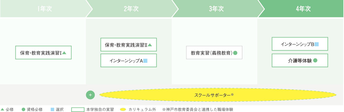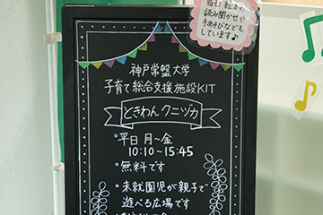 キャンパスでの学びに加えて、実習やボランティア活動など、地域社会と連携する学びの場を用意。子育て総合支援施設「KIT」内には、地域の小学生の学びの広場として「てらこや」が開設されています。また神戸市教育委員会と連携した職場体験として、小学校でのスクールサポーター制度(インターンシップ)も実施しています。