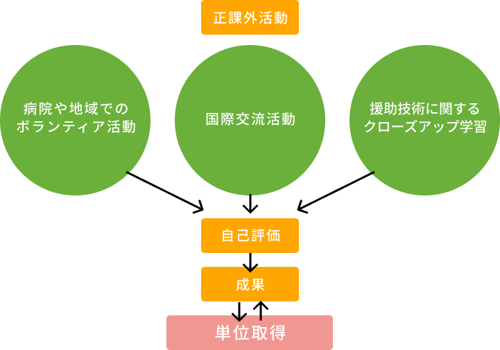 神戸常盤大学看護学部では、授業以外の正課外活動も、正課内では得られない貴重な学びとし、学生個々に関心のある内容に取り組むことで看護における自らの可能性を見出す機会を広げます。一定基準を満たす正課外活動に対して、学生の自己評価を通して成果を認め、単位を与えることで、活動を通して学生が意欲的に学べる機会を設けます。
