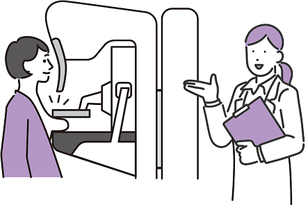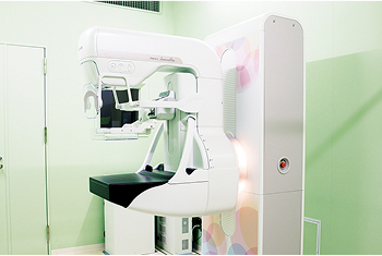 X 線を使用した乳房の検査です。圧迫板で乳房をはさみ、乳房を薄く引き伸ばして撮影します。